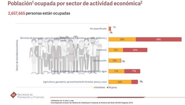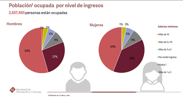 Lamentablemente, con estas graficas no es posible determinar con precisión la jornada laboral semanal de los poblanos que perciben entre 1 y 3 salarios mínimos, aunque por norma general trabajan en promedio entre 45-48 horas. La informalidad y la subocupación se concentran principalmente en el comercio y el sector servicios, lo que explica en buena medida los niveles de desigualdad en el estado.