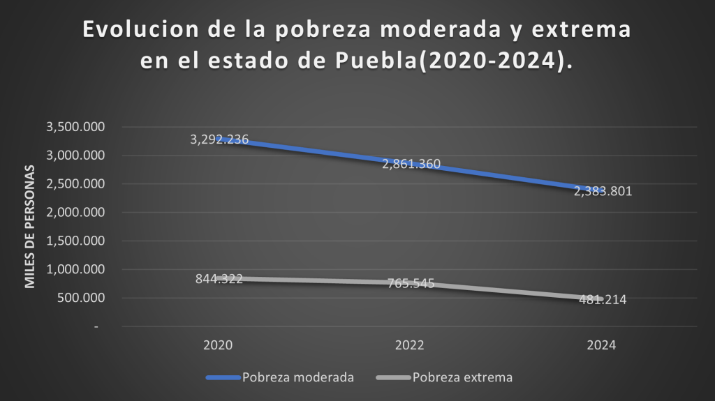 De acuerdo con datos publicados por el INEGI, la pobreza moderada y extrema en Puebla ha mostrado una tendencia a la baja durante el periodo 2020-2024. Sin embargo, el estado mantiene un coeficiente de desigualdad moderado-alto de 0.37, ligeramente por debajo del coeficiente nacional que ronda 0.46. Esta información se deriva de la encuesta «Ingreso corriente total promedio trimestral por hogar, por entidad federativa según deciles de hogares, 2024».