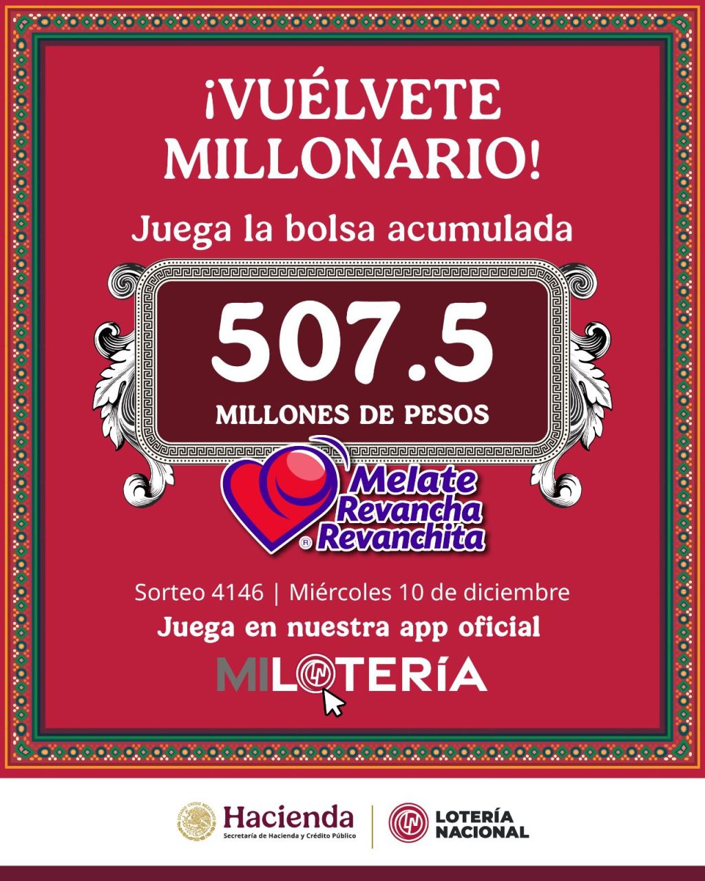 La emoción y la expectativa crecen en todo el país con la bolsa acumulada de Melate, Revancha y Revanchita, que ya alcanza 507 millones 500 mil pesos, consolidándose como la más grande del año. Ante este escenario, Lotería Nacional invita a la ciudadanía a participar en uno de los sorteos electrónicos más emblemáticos, cuya magnitud representa una oportunidad real de transformar la vida de miles de personas con una inversión accesible.