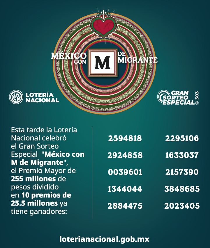 La Lotería Nacional celebró este 15 de septiembre el Gran Sorteo Especial “México con M de Migrante”, en el marco de las fiestas patrias, con una bolsa histórica de 255 millones de pesos dividida en 10 premios de 25.5 millones cada uno. Esta edición, cargada de simbolismo, rindió homenaje a las y los migrantes mexicanos que con su esfuerzo sostienen a sus familias, aportan a la economía y mantienen vivos los lazos de identidad nacional más allá de las fronteras.
