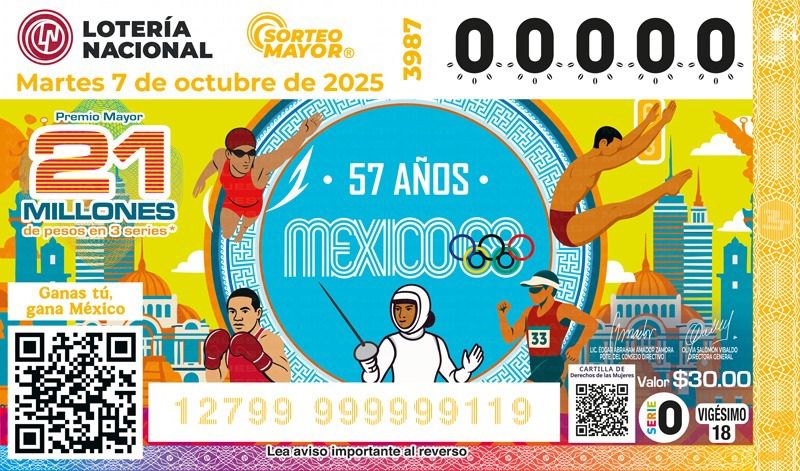 El billete corresponde al Sorteo Mayor No. 3987, que se celebrará el 7 de octubre a las 20:00 horas con un Premio Mayor de 21 millones de pesos en tres series y una bolsa repartible de 66 millones. Se emitieron 3.6 millones de cachitos, disponibles en todo el país y en la plataforma digital de la Lotería Nacional.